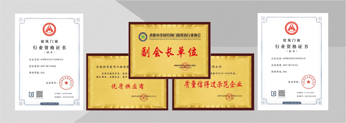 公司本著“以人為本,務實專一,誠信經營,合作共贏”的宗旨,制定了科學完善的管理制度和規范的工作程序, 建立嚴格的出廠檢查機制。公司生產的門窗產品得到了廣大客戶的好評,更是廣大消費者信賴的企業。新領門窗是承德市門窗行業的典范企業。